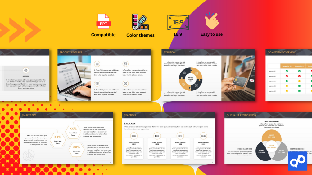 With our template, you can impress potential investors with a visually appealing design and a comprehensive deck that showcases your business vision and growth potential. Our template includes placeholders for custom images, modern layouts, creative infographics, and user-oriented design elements that help you present your business in the best light.