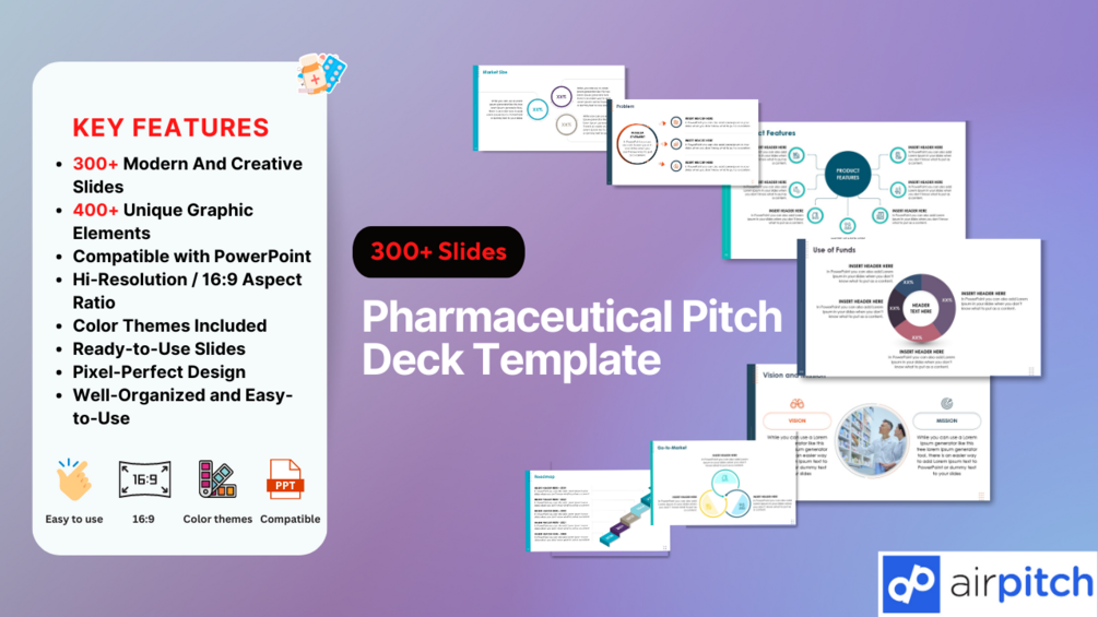 The Ultimate Pharmaceutical Pitch Deck Template is the discovery, development, and manufacturing of a medicine for healing the funding gap and growing your business health. A modern design, scientifically researched insights, and above all a purification of your business idea is fundamental to your success in this world of money business. Our research and deck development expertise in fundraising is essentially advancing the pharma industry for an evolving design to cure all doubts of the potential investors and bring lasting immunity to the business. Deploy this time-tested template, for striking instant chemistry with investors, for a generic or branded pharma company.